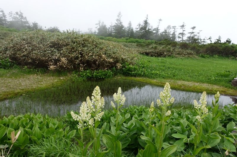 コバイケイソウの蕾 池塘の向こうにオオシラビソ(アオモリトドマツ)
