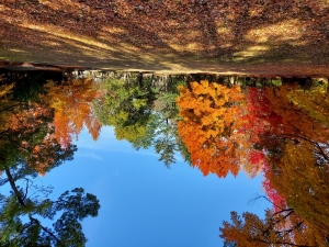 遊歩道の散紅葉が美しく、逆光の木々も映える。練習を忘れて撮影モード(*^-^*)